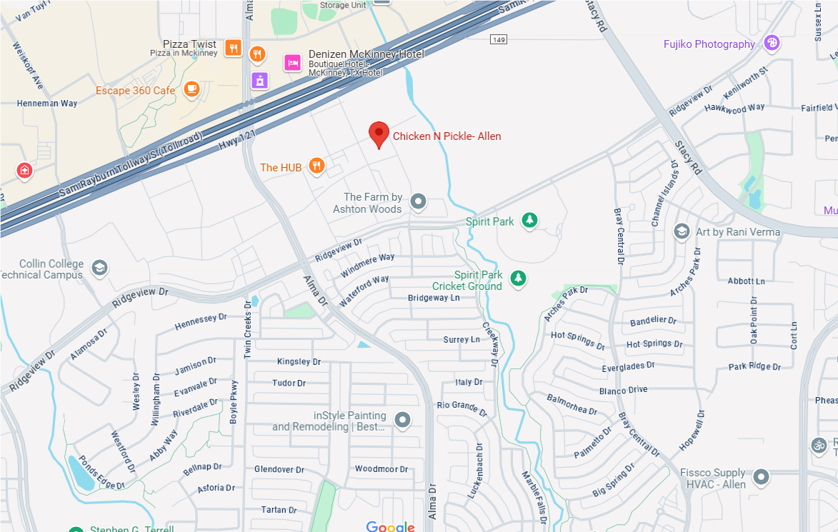 The Chicken N PIckle is located at 1221 Johnson Road just north of the intersection of Alma Road and State Highway 121. The property is accessible from the 121 access road and also from Alma Road.